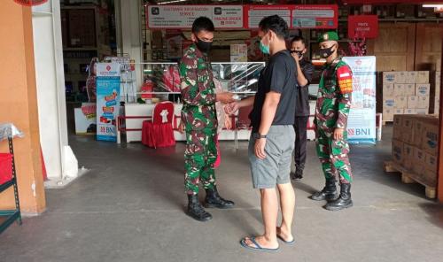 Dua Orang Personil Koramil 03/Senapelan Ajak Pengunjung Lotte Grosir Patuhi Prokes.