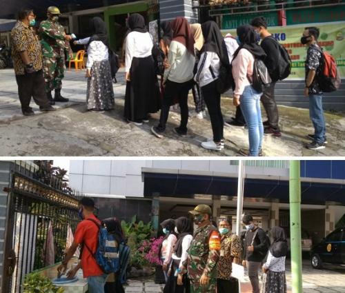 Babinsa Laksanakan Pengawasan Prokes Bagi Siswa Yang Datang ke SMK MUTU