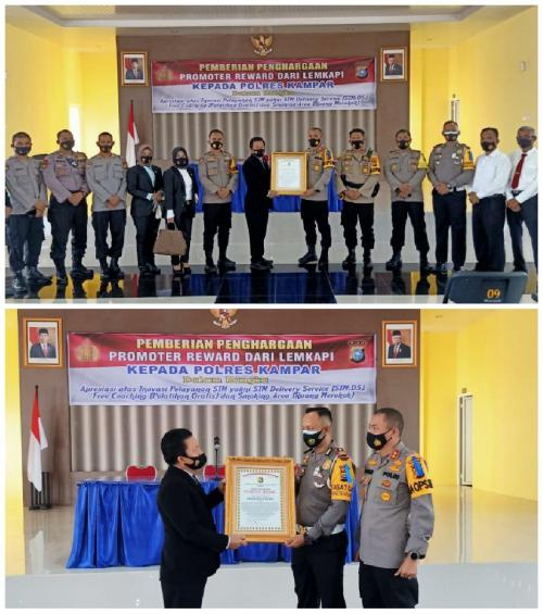 LEMKAPI Anugerahkan Piagam Penghargaan Promoter Reward untuk Polres Kampar