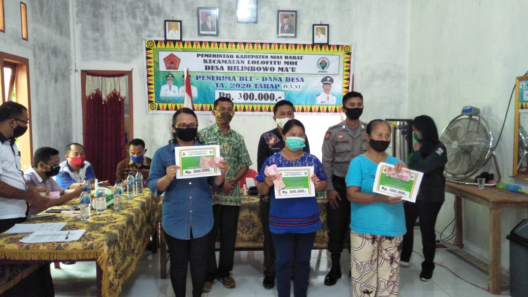 BERITATIME.COM, Nias Barat - Desa Hilimbowo Ma'U Kecamatan Lolofitu Moi Kabupaten Nias Barat melaksanakan penyaluran BLT-DD tahap lV, V dan VI (tiga bulan) yaitu bulan Juli, Agustus dan bulan September 2020, yang dihadiri oleh unsur Forkompika Kecamatan Lolofitu Moi Yareli Halawa, SPd Camat Lolofitu Moi, Anggota Polsek Lolofitu Moi, Kepala Desa beserta aparat, Ketua BPD dan anggota, Tim relawan dan seluruh penerima manfaat. Jum'at (18/9/20).