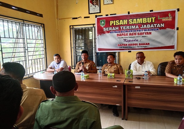 Talang Muandau, Beritatime.com - Pemerintah Desa dan masyarakat Koto Pait Beringin Kecamatan Talang Muandau menggelar acara Pisah sambut dan sekaligus serah terima Jabatan dari kepala desa lama definitif (2017--2023) Abu Sofyan kepada Pj. Kades baru Abdul Bakar, yang di laksanakan di Aula kantor Desa Koto Pait pada Rabu (13/09/2023).