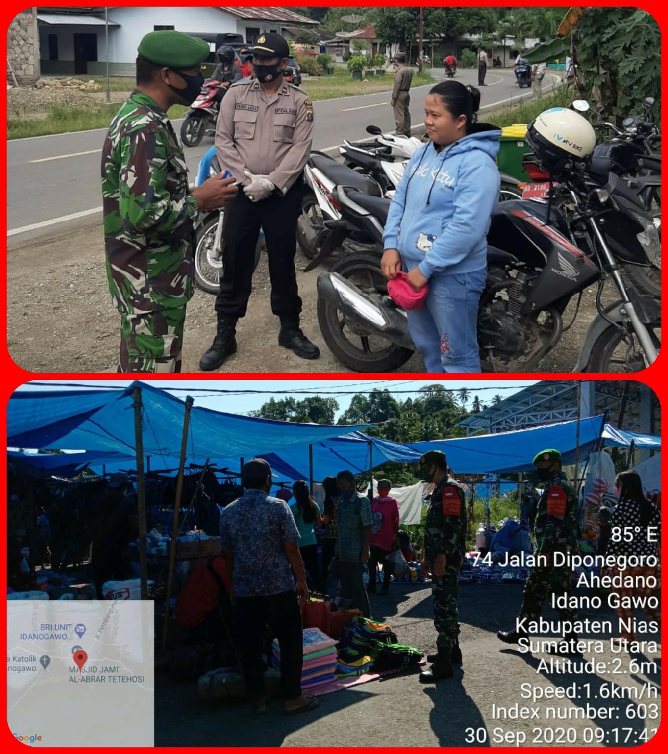 Personil Koramil 03/Idanogawo Kodim 0213/Nias Sertu Kurniaman Zai dan Koptu Wisman Halawa Melaksanakan Patroli dan Himbauan Wajib memakai masker di Pasar Tetehosi Kecamatan. Idanogawo Kabupaten Nias.