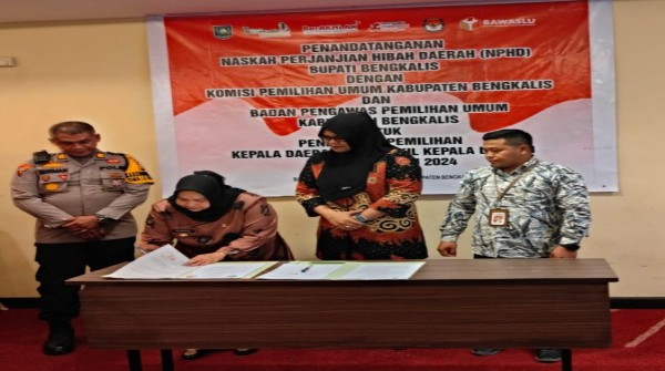Penandatanganan dilakukan Bupati Kasmarni bersama Ketua KPU Kabupaten Bengkalis Elmiawati Safarina dan Ketua Bawaslu Usman.