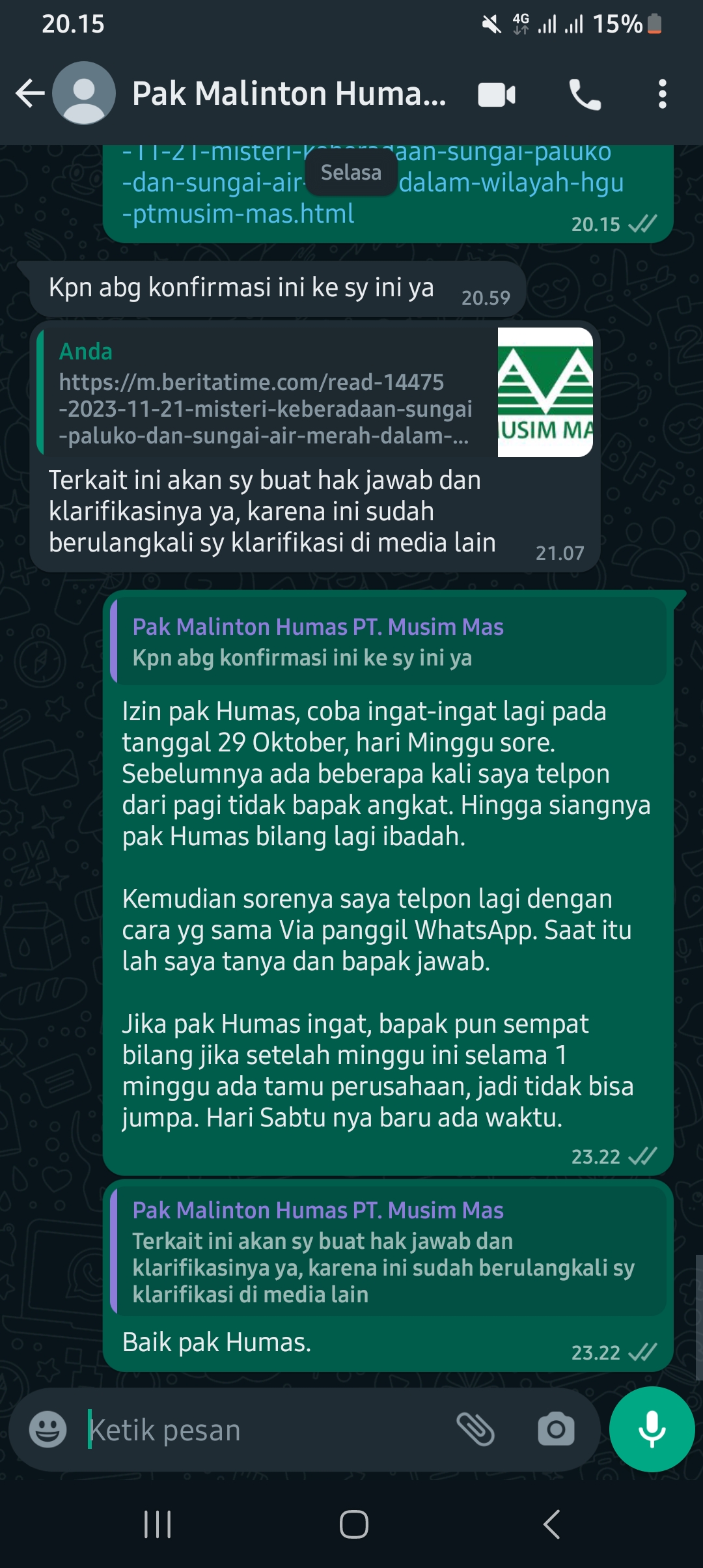 Respon Humas PT.Musim Mas, Malinton, melalui WhatsApp.