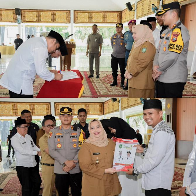 Bupati Bengkalis Kasmarni menyerahkan Surat Kerja (SK) Penyuluh Agama Islam (Da'i) Desa/Kelurahan serta Koordinator Kecamatan se-Kabupaten Bengkalis, Selasa, 16 Januari 2024 di Balai Kerapatan Wisma Sri Mahkota Bengkalis.