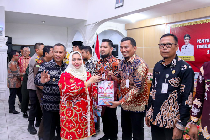 Teks foto: Bupati Bengkalis, Kasmarni saat launching ratusan ribu paket sembako murah, kegiatan ini sebagai salah satu langkah menekan kemiskinan ekstrem di Kabupaten Bengkalis