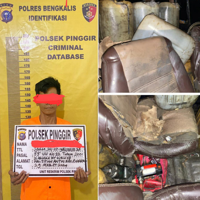 " Selanjutnya tepat pada hari Jumat tanggal 29 Maret 2024 di jalan Lintas Duri - Pekanbaru di desa Muara Basung Kec. Pinggir Kab.Bengkalis Tim Opsnal memberhentikan mobil Panther tersebut dan Berhasil mengamankan satu orang laki laki yang mengaku bernama Inisial MA(38 tahun), yang beralamat dan tinggal di Jl.Aksara Kel.Titian Antui Kec.Pinggir, dan dari dalam Mobil tersebut terdapat barang bukti 30 buah Jeregen berisi minyak Solar dan selanjutnya tersangka dan Barang Bukti di bawa ke Polsek Pinggir untuk di amankan demi penyelidikan dan penyidikan lebih lanjut" Jelas Kapolsek.
