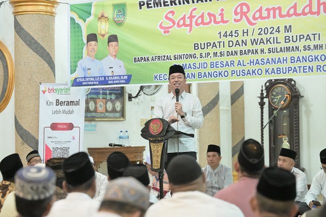 Bupati dalam sambutannya menyampaikan tujuan safari Ramadan adalah untuk menjalin silaturahmi, guna meningkatkan ukhuwah islamiyah di antara semua komponen masyarakat. Pihaknya merasa sangat berbahagia karena dapat berkumpul bersama dengan masyarakat Kecamatan Bangko Pusako dan sekitarnya pada puasa malam ke-15 Ramadan." Terimakasih saya ucapkan dan juga selamat datang kepada camat, lurah, datuk dan datin penghulu kecamatan bangko pusako sengaja kami hadir dalam acara safari ramadan ini guna menjaga silaturahmi guna meningkatkan ukhuwah islamiyah kita bersama," ujarnya.