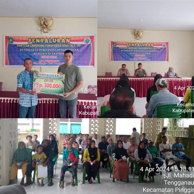 Pemerintah Desa Tengganau Kecamatan Pinggir Kabupaten Bengkalis Menyalurkan Bantuan Langsung Tunai (BLT) yang bersumber dari Dana Desa Tahun Anggaran 2024 sebanyak 102 KPM Keluarga Penerima Manfaat Menerima BLT-DD Sebesar Rp.300.000 per bulan dan pada tahap I total sebesar Rp. 900.000 dari bulan Januari, Februari dan Maret.