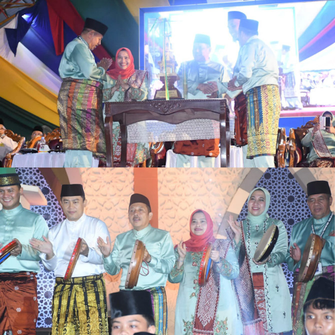 Selain menyerahkan piala juara umum MTQ tahun lalu kepada penyelenggara, Bupati Kasmarni juga ikut menabuh kompang tanda dimulainya MTQ tingkat Provinsi Riau ini. Sumber (inf/Diskominfotik)
