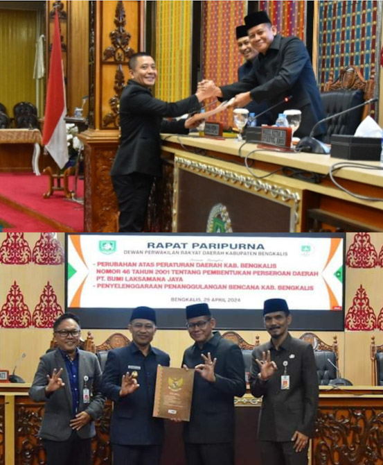 Bengkalis, Humas DPRD, BERITATIME.COM Guna mengoptimalisasikan potensi daerah, Pemkab Bengkalis menyampaikan Ranperda Perubahan atas Peraturan Daerah Kabupaten Bengkalis Nomor 46 Tahun 2001 tentang Pembentukan Perseroan Daerah PT. Bumi Laksamana Jaya dan Ranperda tentang Penyelenggaraan Penanggulangan Bencana Kabupaten Bengkalis, Senin (29/04/2024).