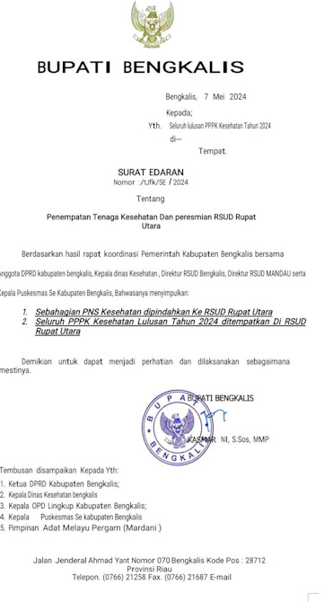 Saat ini viral Surat Edaran (SE) yang di tandatangani langsung oleh Bupati Bengkalis Kasmarni tentang Penempatan Tenaga Kesehatan dan Peresmian RSUD Rupat Utara.