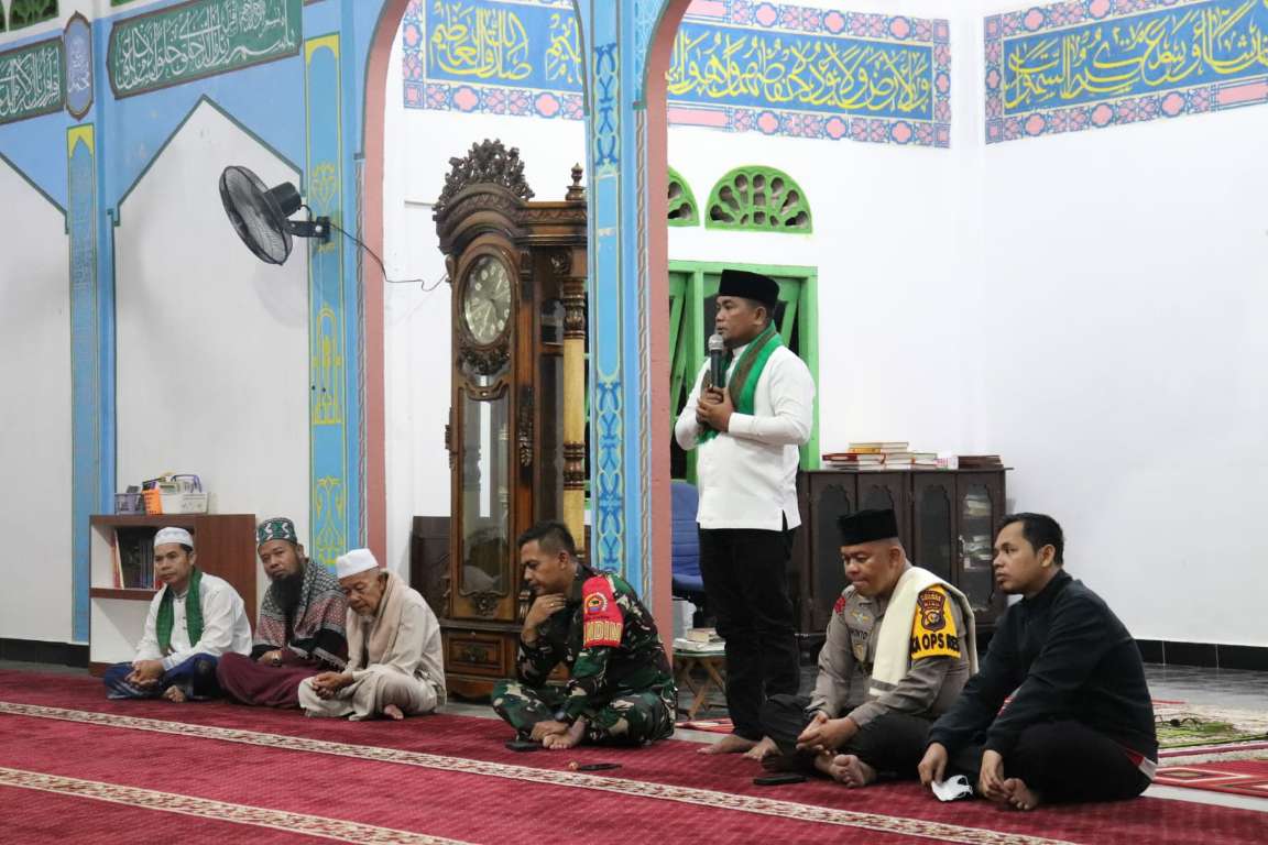Foto ; Bupati Pelalawan H. Zukri. SE saat sholat subuh harmoni memberikan sambutan di salah satu mesjid pulau Mendol Kuala Kampar.