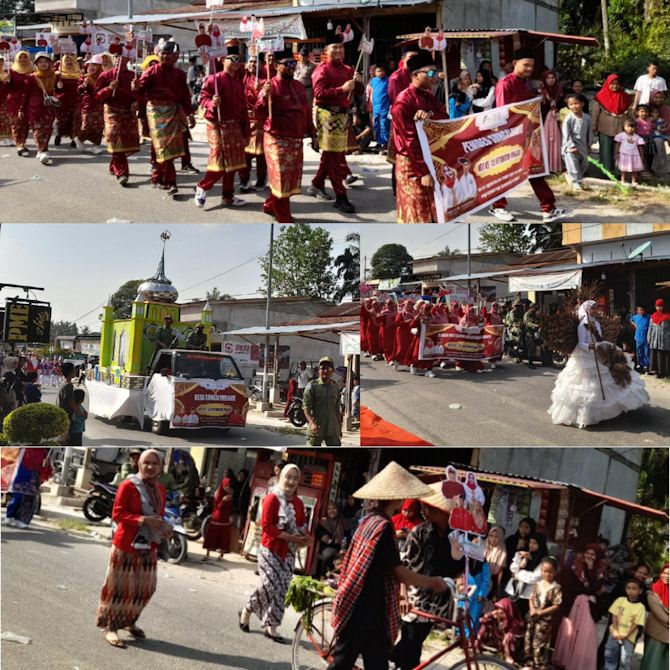 Dengan Menampilkan MOBIL HIAS, Barisan Drum band SMA 6 pinggir sungai meranti, Kafilah desa Buluh apo, Kepala desa beserta perangkat desa dan BPD, PKK, LPMD, RT/RW, Barisan pakaian adat, parade baju daur ulang, sepeda petani, barisan Linmas. (BTC-IZP)