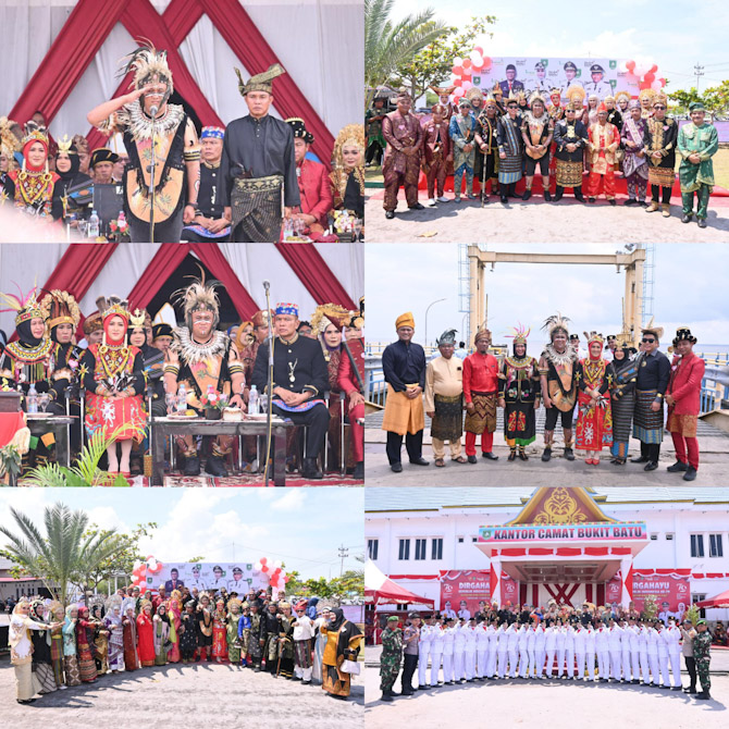 BUKIT BATU, BERITATIME.COM Pelaksanaan upacara memperingati Hari Ulang Tahun (HUT) ke-79 Kemerdekaan Republik Indonesia di Kantor Camat Bukit Batu menjadi sorotan sejumlah mata masyarakat. Pasalnya para peserta upacara menggunakan pakaian adat dari berbagai daerah di Indonesia, Sabtu, 17 Agustus 2024.