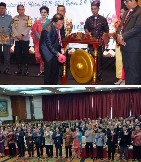 Ephorus BNKP Pdt. Otoriteit Dakhi, S.Th., M.Si, saat membuka Sidang, ditandai pemukulan Gong, disaksikan sejumlah Undangan, di Hotel Labersa, Kampar, Provinsi Riau, Kamis (29/8/2024) jelang sore [Ft: Panitia]