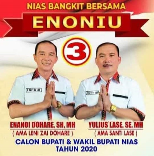 Untuk diketahui bersama ENONIU adalah kepanjangan dari nama calon pasangan Bupati dan Wakil Bupati Kabupaten Nias nomor urut 3 yaitu ENANOI DOHARE – YULIUS LASE yang artinya Hamba atau Pelayan masyarakat.