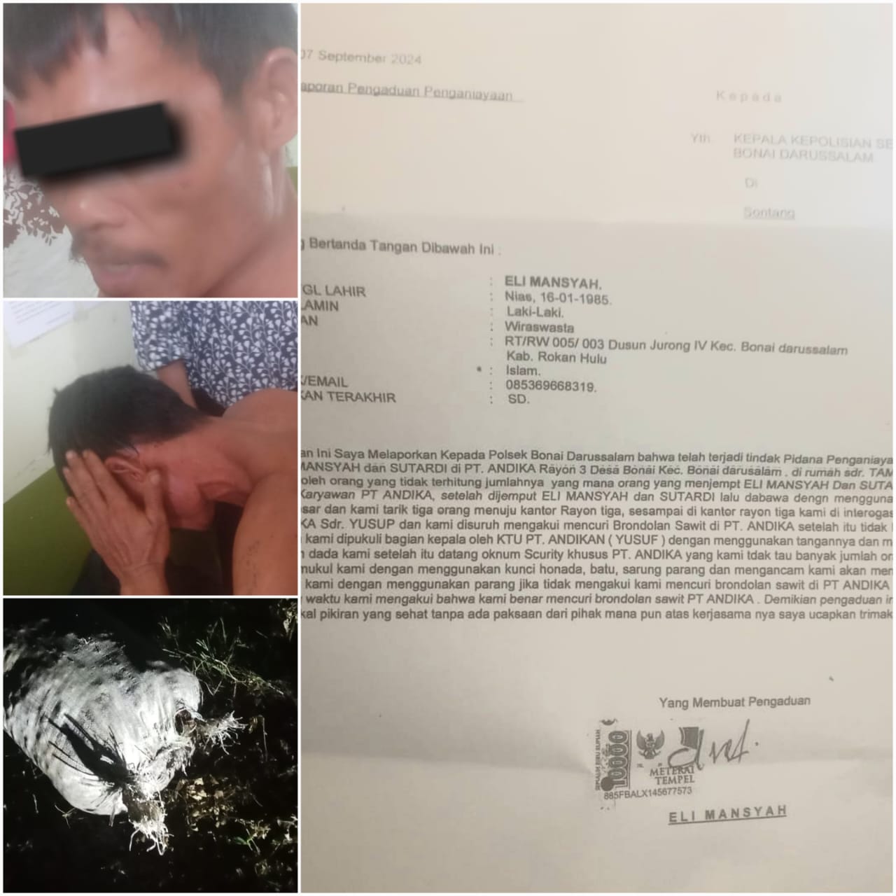 Atas kejadian tersebut, EM pun membuat Laporan Pengaduan Penganiayaan di Polsek Kecamatan Bonai Darussalam, Kabupaten Rokan Hulu (Rohul) pada 7 September 2024.Kepada awak media, EM mengaku bahwa bahwa bari pertama kali melakukan itu dan karena terpaksa demi mencukupi kebutuhan keluarga. Namun naas nya, ia mendapat siksaan yang dinilai tidak sesuai atas perbuatannya.Bagaimana tidak, menurut keterangan EM, ia hanya mengambil brondolan sawit yang tidak diambil oleh karyawan atau pekerja dari PT.ANDIKA, lebih tepatnya brondolan yang masih ada di tandan busuk di dalam parit. Brondolan tersebut juga telah dilihat langsung oleh wartawan dan Kanit Reskrim Polsek Bonai Darussalam, dan benar brondolan busuk.