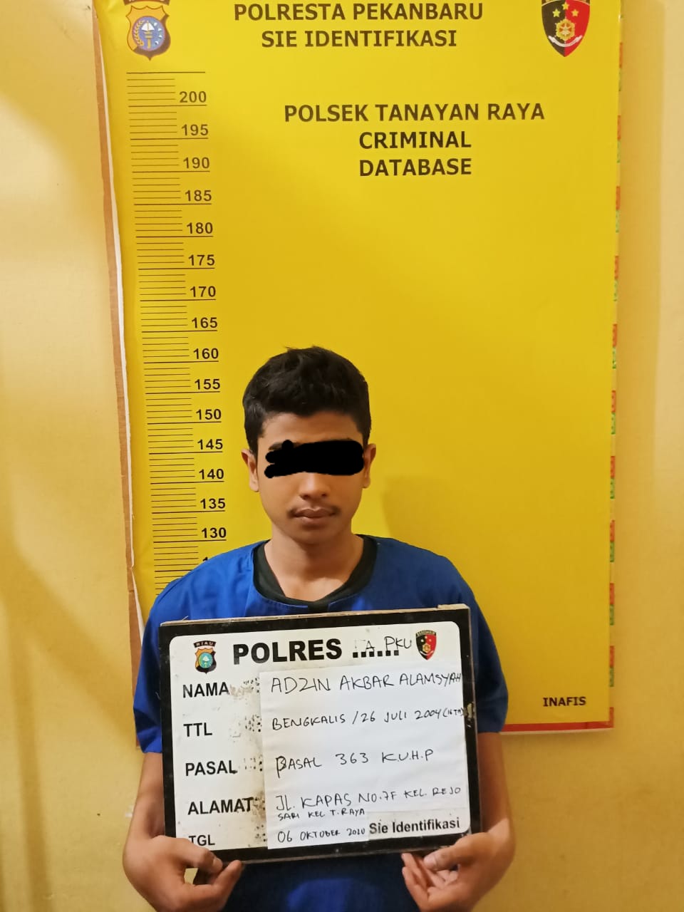 Kapolresta Pekanbaru Kombes Pol H.Nandang Mu’min Wijaya., S.I.K ., M.H melalui Kapolsek Tenayan Raya Kompol H.M. Hanafi membenarkan, telah melakukan penangkapan tersangka inisial AAA alias Ajin warga Kecamatan Tenayan Raya Kota Pekanbaru pada hari Selasa tanggal 6 Oktober 2020, tersangka ditangkap dalam perkara pencurian handphone.