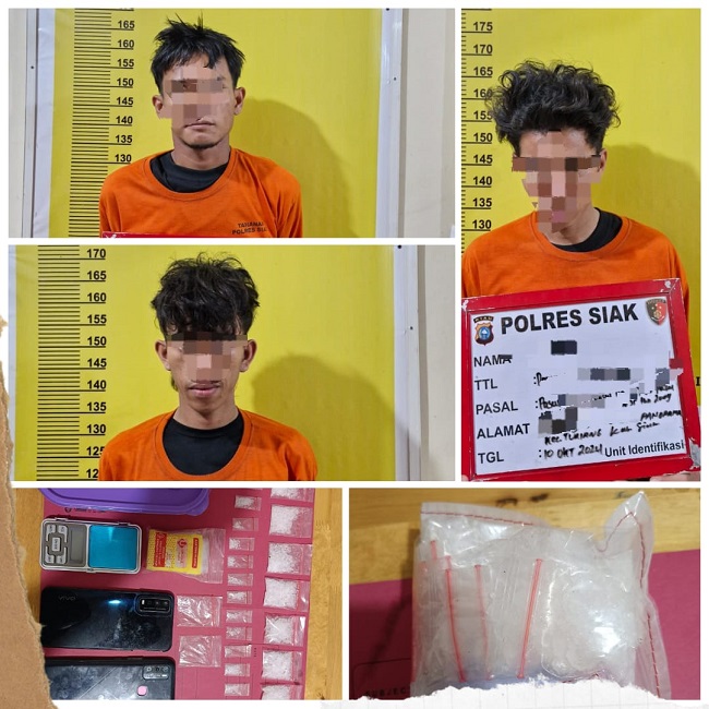 MI (26), RR (24), AS(25) diamankan Satres Narkoba Polres Siak dengan barang bukti 26 (dua puluh enam) Paket Narkotika jenis Shabu dengan berat kotor 44,30 (empat puluh empat koma tiga puluh) gram.