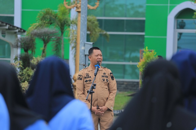 Foto : Sekretaris Daerah Kota (Sekdako) Pekanbaru Indra Pomi Nasution Memimpin Apel Pagi bersama seluruh ASN dan THL Rumah Sakit Daerah (RSD) Madani Pekanbaru, Senin (14/10/2024).