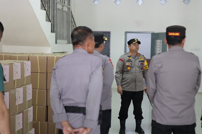 Kapolres langsung mengecek kondisi logistik yang sudah berada di gudang dan seluruh personil pengamanan baik dari Polri maupun dari internal KPUD Siak.