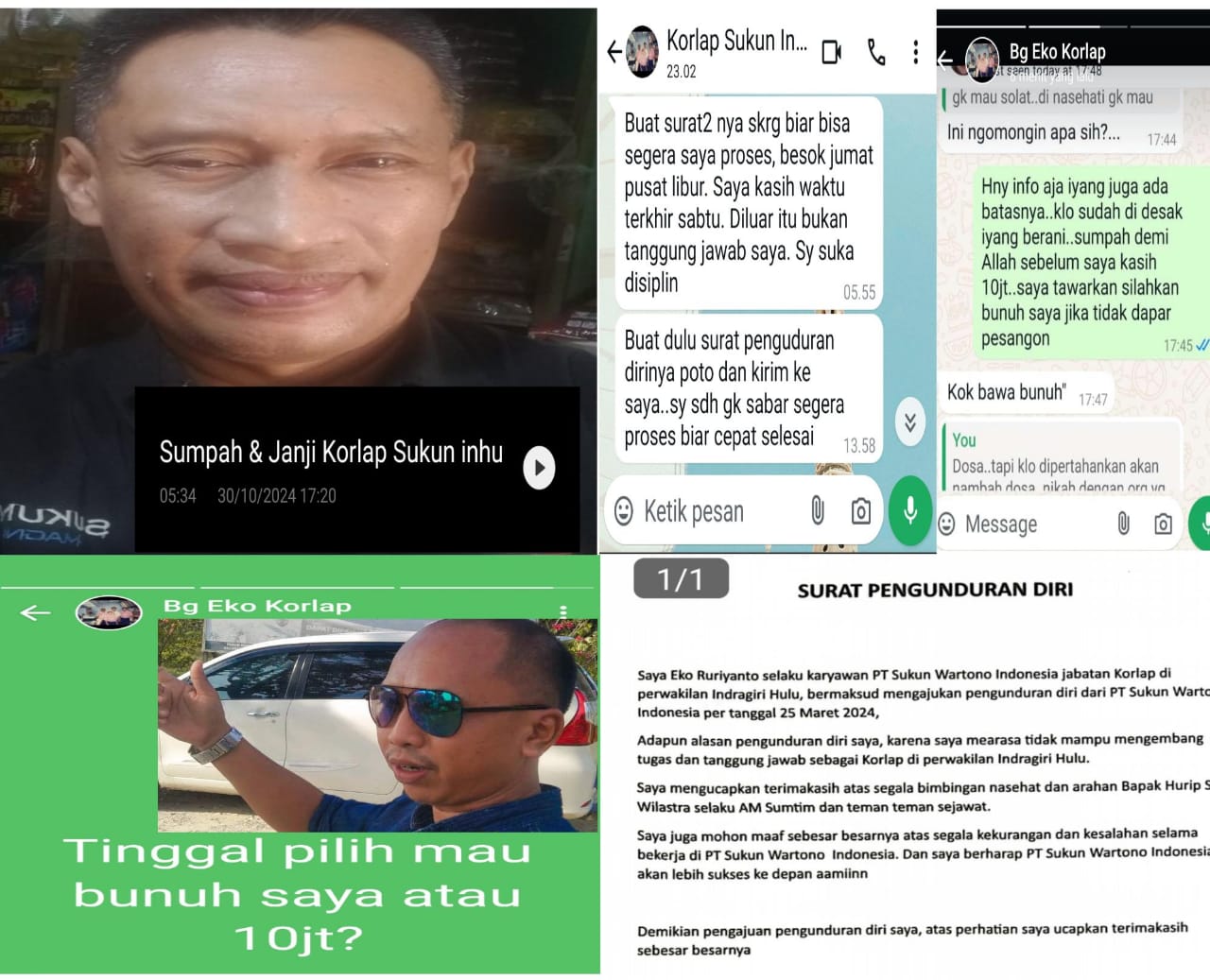 "Saya diminta buat surat pengunduran diri agar diberikan Pesangon sebesar sepuluh juta rupiah. Saya didesak melalui chat Whatsap oleh Korlap Inhu, katanya, buat dulu surat pengunduran diri, foto dan kirim ke saya, saya sudah nggak sabar cepat proses biar cepat selesai," kata Jono mengutarakan pesan Whatsap Eko Rurianto kepada dirinya.
