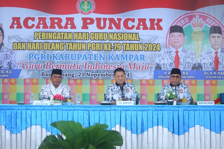 Bangkinang,Beritatime.com - Penjabat Bupati Kampar Hambali, SE, MBA, MH menghadiri peringatan Hari Guru dan Hari Persatuan Guru Republik Indonesia (PGRI) ke-79 tingkat Kabupaten Kampar. Peringatan Hari Guru dan Hari Jadi PGRI ke-79 itu digelar di Aula Gedung Guru Bangkinang Kota. (21/11) Hadir mendampingi Pj. Bupati Kampar diantaranya, Kepala Dinas Pendidikan dan Olahraga Kabupaten Kampar Aidil, Ketua PGRI Kampar M. Yasir serta seluruh pengurus PGRI dan seluruh Guru se-kabupaten Kampar.
