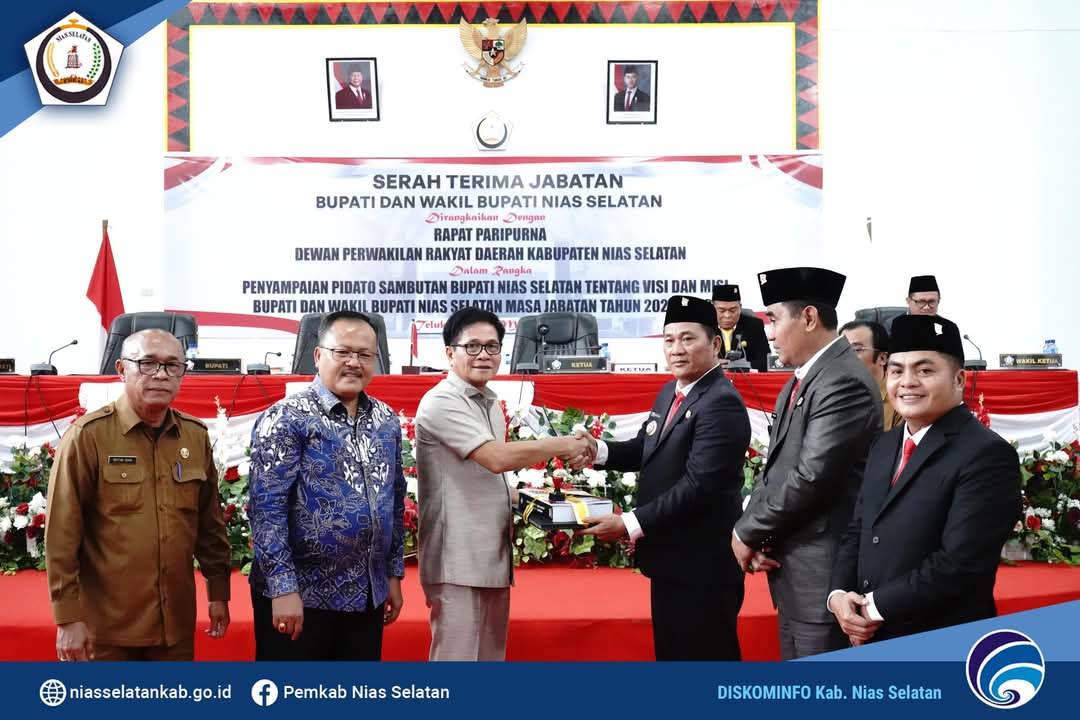 Nias Selatan - Beritatime.com- Dewan Perwakilan Rakyat Daerah (DPRD) Kabupaten Nias Selatan menggelar Rapat Paripurna dengan Agenda serah terima jabatan Bupati dan Wakil Bupati Nias Selatan yang dirangkai dengan penyampaian Pidato Sambutan Bupati tentang Visi Misi Bupati dan Wakil Bupati Nias Selatan masa jabatan 2025-2030 dipimpin oleh Ketua DPRD Elisati Halawa, ST bertempat Ruang Sidang DPRD Kab. Nias Selatan Jl. Saonigeho Km. 3 Teluk Dalam (Senin, 03/03/2025).