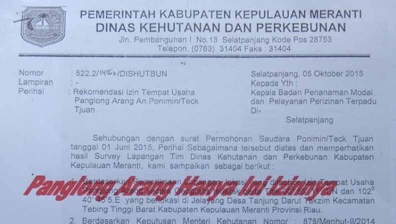 BERITATIME.COM, Meranti - Panglong arang yang tersebar di Kabupaten Kepulauan Meranti tidak satupun mengantongi izin industri dan izin usaha pemanfaatan hasil hutan. Izinnya menggarap hutan kayu bakau secara illegal hanya mengkantongi sebentuk rekomendasi dari Dinas Kehutanan Kabupaten Kepulauan Meranti oleh Ir.Mamun Murod,MM.MH, tahun 2015 silam.