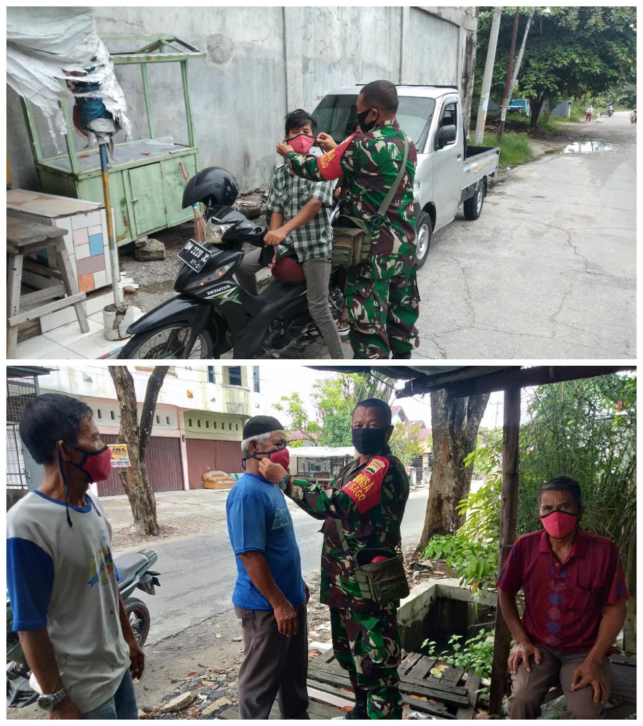BERITATIME.COM-PEKANBARU- Babinsa Kelurahan Sago Koramil 03/Senapelan Kodim 0301/Pekanbaru Serda Yulianto membagikan masker kepada warga, sebagai bentuk kepeduliannya terhadap pencegahan penyebaran wabah Covid-19. Jum'at 23-10-2020.