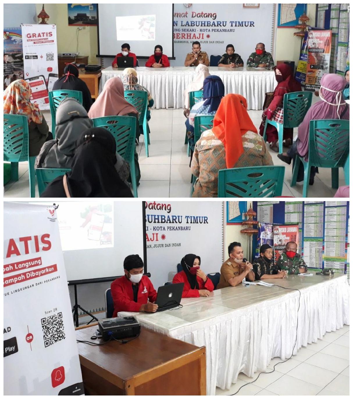 Kegiatan sosialisasi Aplikasi Pemulung Online (Pemol) ini dilaksanakan di Aula Kantor Kelurahan Labuh Baru Timur Jl. Serayu Kelurahan Labuh Baru Timur Kecamatan Payung Sekaki. Dihadiri oleh ; Lurah Zulkifli, S.Hi, Babinsa Serda Saliman, Ketua Forum RT-RW M. Abbas, serta kader-kader PKK sebagai peserta. Dengan narasumber Ibu Nurni Sifki Shofwa, S.P dari Bank Sampah Tuan Di Bangarna.