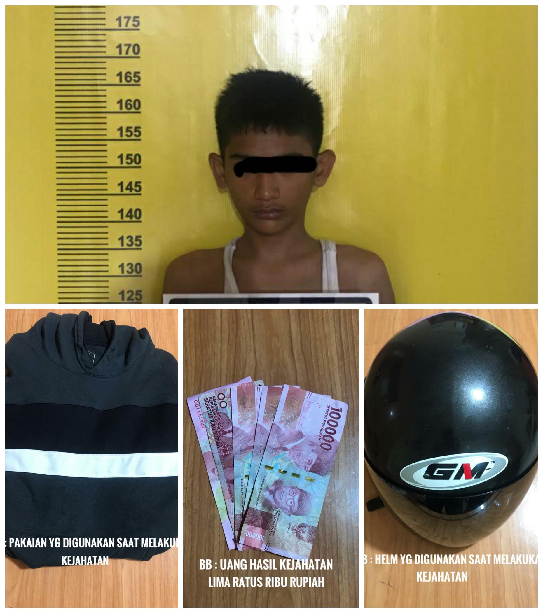 Adapun barang bukti yang diamankan dari tersangka IS alias Putra alias Unyil sebut Kapolsek, uang hasil kejahatan sebesar Rp.500 ribu rupiah, sebuah helm merek GM Evolution yang digunakan saat melakukan aksi kejahatan, sehelai sweater atau jaket warna abu-abu motif garis warna hitam - putih atau pakaian yang digunakan saat melakukan aksi kejahatan.