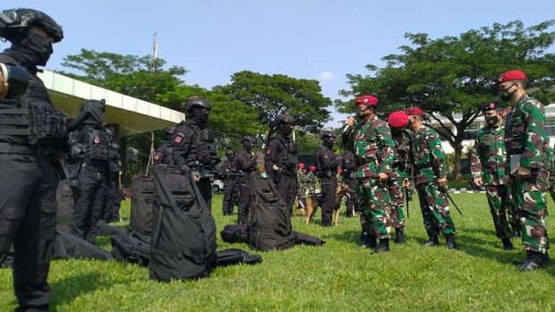 Panglima TNI Marsekal Hadi Tjahjanto mengecek kesiapan pasukan Kopassus. (Sachril Agustin Berutu/detikcom)