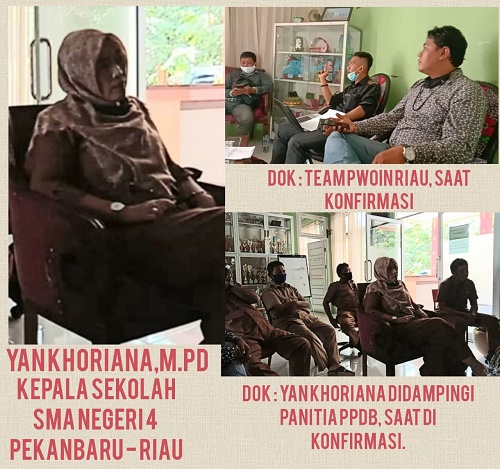 Namun amat di sayangkan, informasi yang diperoleh darinya (Yan Khoriana) selaku Kepala Sekolah SMA Negeri 4 Pekanbaru Provinsi Riau diduga berbanding terbalik dan/atau tidak sesuai dengan data yang diperoleh dan dimiliki Team DPW PWOIN dan LIRA Riau, dimana dalam aplikasi situs PPDB Riau : https://riau.siap-ppdb.com/#/030001/daftar/peserta/31264/1, untuk jumlah peserta didik zonasi 200 siswa, sementara pada Selasa (30/06/2020) jumlas peserta menjadi 371 Siswa pada situs situs : https://riau.siap-ppdb.com/#/030001/daftar/peserta/31264/1. dan https://riau.siap-ppdb.com/#/030101/daftar/peserta/31264/1 siswa didik jalus afirmasi berjumlah 58 siswa, situs https://riau.siap-ppdb.com/#/030201/daftar/peserta/31264/1 prestasi 191 siswa, Situs https://riau.siap-ppdb.com/#/030201/daftar/peserta/31264/1 Jalur Perpindahan Tugas Orang Tua berjumlah 7 Siswa didik