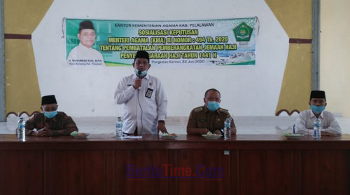 BERITATIME.COM, Pelalawan - Kepala Kantor Kementrian Agama Kabupaten Pelalawan H. Muhammad Rais, M.Pd.I kunjungi Kecamatan Kerumutan dalam rangka mensosialisasikan Keputusan Menteri Agama (KMA) RI Nomor 494 Tahun 2020 tentang pembatalan pemberangkatan Jemaah Haji Tahun 1441 H.