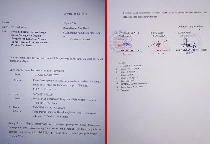 BERITATIME.COM, Nias Barat -Ketua Lembaga Swadaya Masyarakat (LSM) Strategi Nias Barat Tuhogo Maruhawa, bersama dua Organisasi Masyarakat (Ormas) lainnya di Nias Barat yakni Garda Bela Negara Nasional (GBNN)Ketua Faoheta Hulu dan Angkatan Muda Pembaharuan Indonesia (AMPI) yang dipimpin Tolondaodo Waruwu, surati Bupati Nias Barat Cq. Inspektorat pada kamis 25/06/2020, Tentang Permohonan Informasi perkembangan Kasus dugaan penggelapan Keuangan Negara/Barang barang Panti Asuhan Milik Pemkab Nias Barat, Sampai Saat ini tidak ada jawaban tertulis yang disampaikan kepada kami.