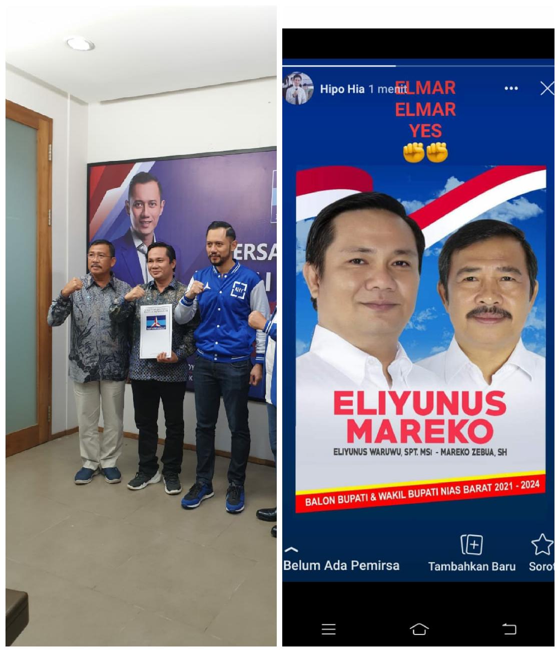 BERITATIME.COM,-NIAS BARAT,- Pasangan Calon Bupati Nias Barat Eliyunus Waruwu dan Mareko Zebua(ELMAR) setelah mendapat rekomendasi dari partai GOLKAR dan- partai Nasdem minggu lalu hari ini dapat kepercayaan lagi dari partai DEMOKRAT rekomendasinya diserahkan langsung ketua umum Agus Harimurti Yudoyono (AHY)didampingi ketua DPD Sumut Heri- Zulkarnain Hutajulu dan ketua DPC Nias Barat Nitema Gulö dikantor DPP Demokrat Jakarta(rebu 22/07/2020).