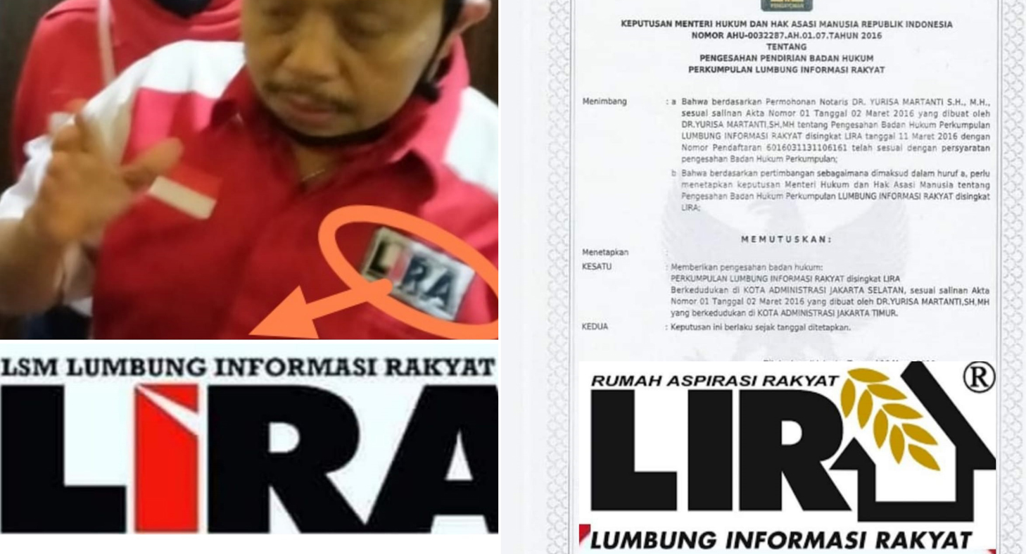 1. Kemenkumham - Kemenkumham Nomor AHU-0060963.AH.01.07 Tahun 2016 tentang Pengesahan Pendirian Badan Hukum Perkumpulan LSM LIRA INDONESIA, diduga Kemenkumham milik LIRA yang di Pimpin oleh Jusuf Rizal selaku Presiden LIRA. Kemenkumham tersebut juga diduga berdasarkan pengajuan permohonan Notarisnya yang bernama Maria GUNARTI SH,MKN, sesuai salinan akta nomor 39 tanggal 20 Mei 2016 yang dibuat oleh Maria GUNARTI tentang Pengesahan Badan Hukum Perkumpulan LSM LIRA Indonesia tertanggal 30 Mei 2016 dengan nomor Pendaftaran 601605301107745.