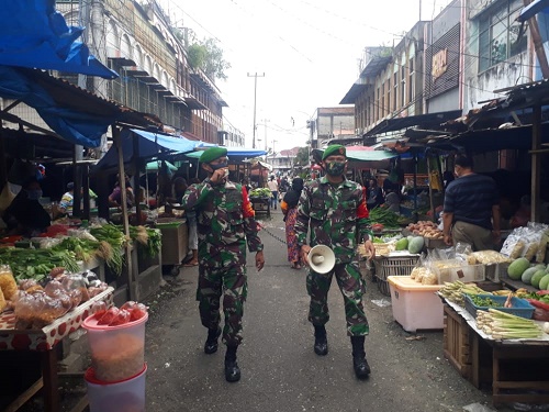 BERITATIME.COM - Mempergunakan pengeras suara, Babinsa Koramil 03/Senapelan Kodim 0301/Pekanbaru Serda Dani Trisnanto dan Serda Supriadi melaksanakan sosialisasi pelanggaran protokoler kesehatan kepada masyarakat di Pasar Sago. Selasa 11-08-2020.