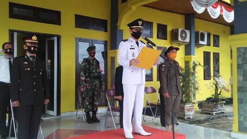 BERITATIME.COM, Pelalawan - Upacara Pengibaran Bendera Merah Putih dalam rangka Hari Ulang Tahun (HUT) RI yang Ke-75 di halaman kantor Camat Ukui pada Senin, 17 Agustus 2020 berlansung khidmat.