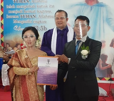Seperti resepsi pemberkatan pernikahan yang di langsungkan di Gereja Niha Keriso Protestan Indonesia ( GNKP - Indonesia) Jemaat Perawang Jalan M. Ali Ujung Kampung Perawang Barat menerapkan sejumlah Protokol kesehtan Covid-19. Sabtu (22/08/2020)