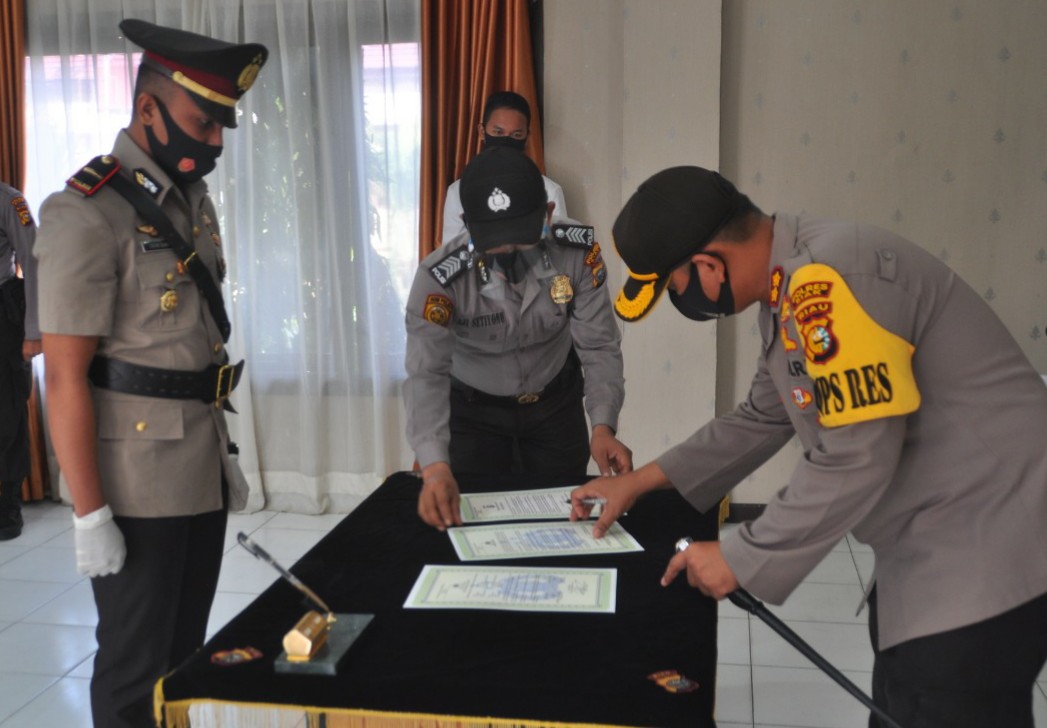 " Giat sertijab hari ini berbeda dengan sertijab yang terdahulu, karena situasi di masa pandemi Covid - 19 yang biasanya di laksanakan dilapangan kita melaksanakan di Aula dengan disaksikan Pejabat Utama Saja tentunya tetap mematuhi protokol Kesehatan Seperti Pengecekan Suhu tubuh seluruh peserta, menggunakan masker, membersihkan tangan dengan Hand Sanitizer serta tetap menjaga jarak." Terang AKBP Doddy.